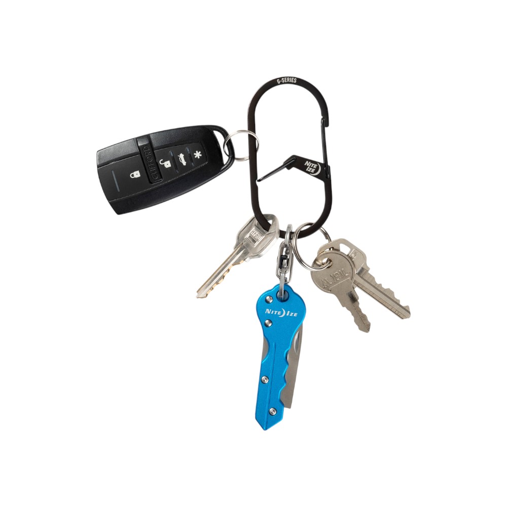 Featuring two connected, yet distinct chambers and built with strong stainless steel, the G-Series simplifies key carrying without sacrificing security. Simply load your keys into the first chamber of the carabiner, then pass them through the inner gate to the second chamber to secure. This two-layered security system allows you to easily clip the carabiner onto belt loops or bags and change keys as needed, while keeping your keys securely attached in the bottom chamber. The G-Series securely holds keys of virtually any design, including key fobs and international keys.Easy to secure + removeDual chambers for added security – Use chamber 1 to clip to bags/belts + access keys; Use chamber 2 to hold + secure keys long-termNovel G design prevents accidental gate disengagement + key lossHigh quality stainless steel constructionSecure stainless steel wire gate closureUniversal design holds nearly any key, accessory, or fob