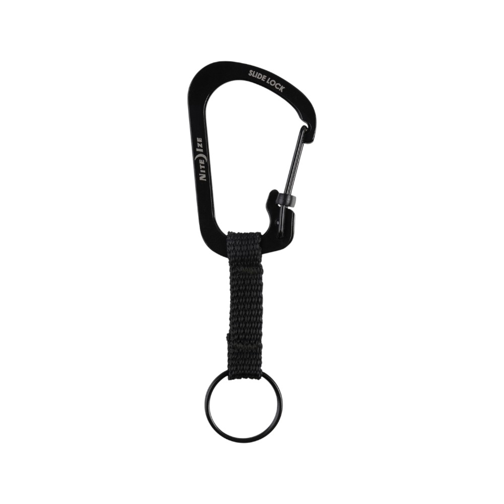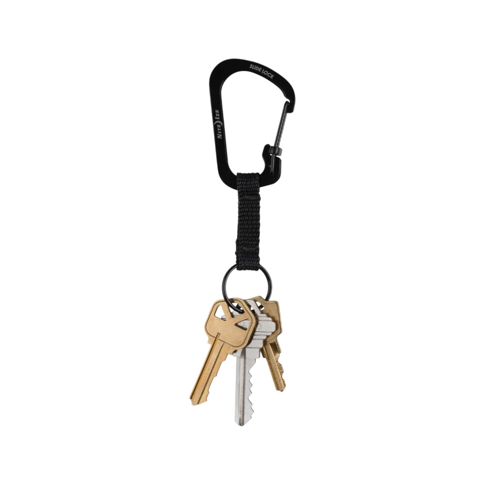This key holding solution pairs a secure stainless steel #3 SlideLock Carabiner with a durable key ring and joins them with a strong 1″ nylon webbing strap. This combination creates a great way to keep keys connected, yet separate. The Carabiner can be clipped and locked to anything like a belt loop, backpack or water bottle, while the key ring hangs freely from the webbing strap.Durable stainless steel locking utility carabiner and key ring combinationSecure stainless steel wire gate with a slide-to-lock featureHigh tensile strength nylon webbing3/8″ split ring key attachmentCarabiner weight rating: 25 lb